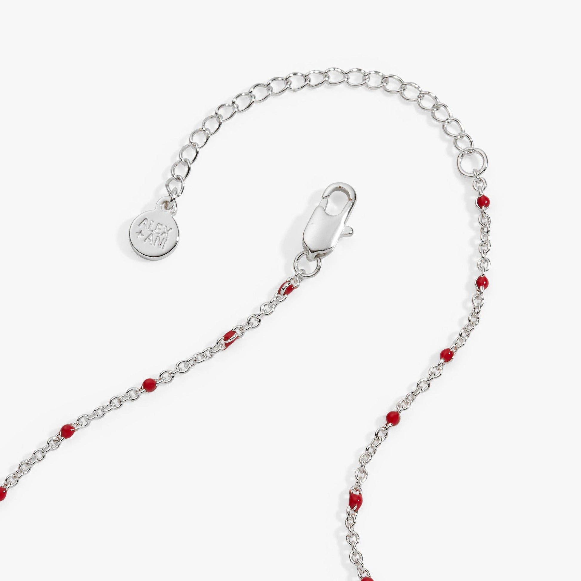 This festive necklace features an enamel beaded chain adorned with a charming candy cane pendant decorated in bright red enamel stripes and sparkling clear crystal pave accents that catch the light beautifully. Adding to its festive appeal is a delightful wrapped candy charm, detailed with bezel-set clear crystals that shimmer with every movement. Perfect for celebrating the holiday season or adding a touch of sweetness to any outfit, this pendant brings fun and sparkle to your jewelry collection.