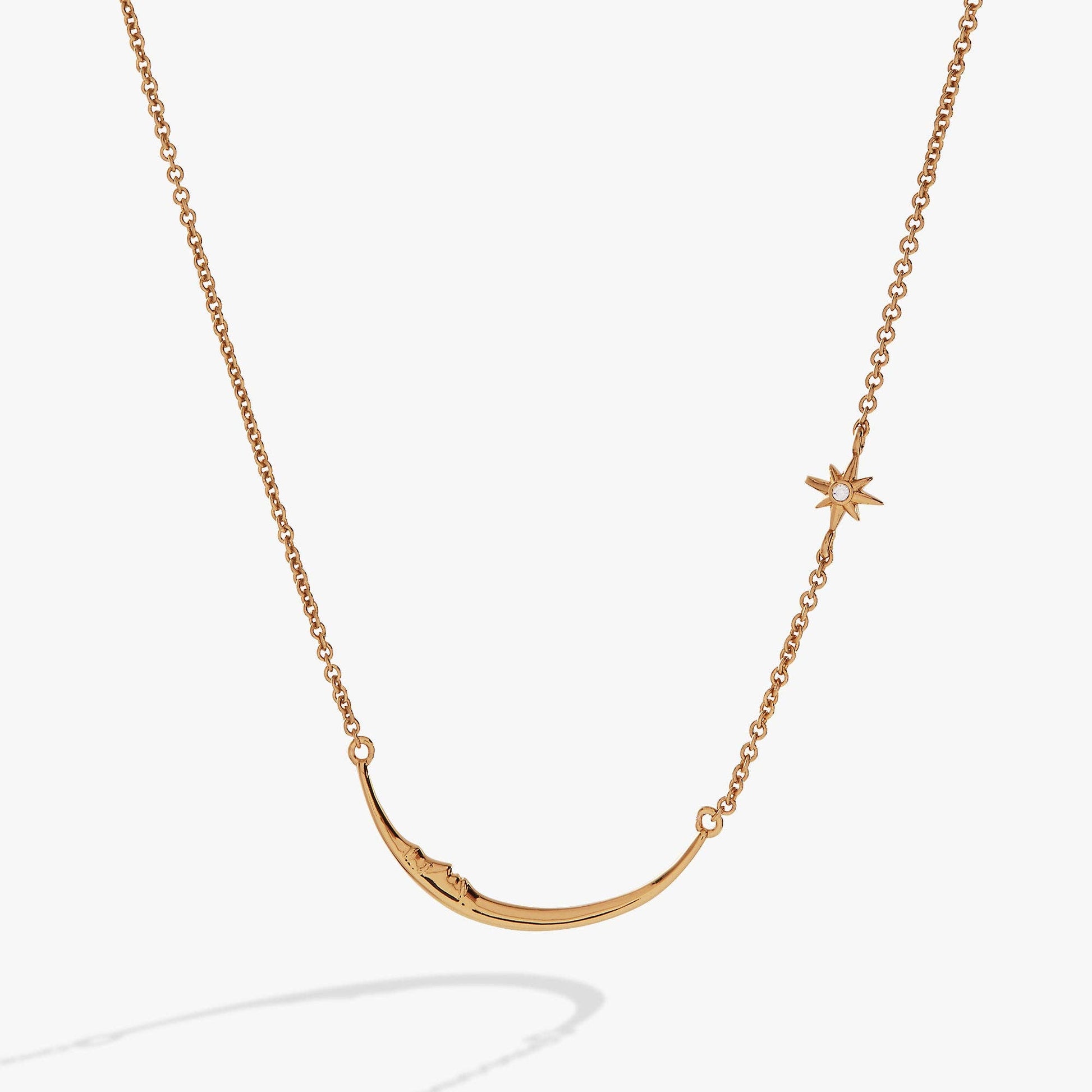 Wear the mystery of the night close to your heart. This delicate necklace features a crescent moon with a soft silhouette face and a sparkling crystal star—capturing the quiet beauty of moonlit skies.
