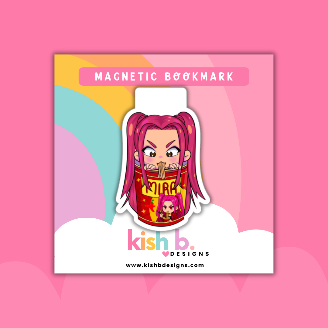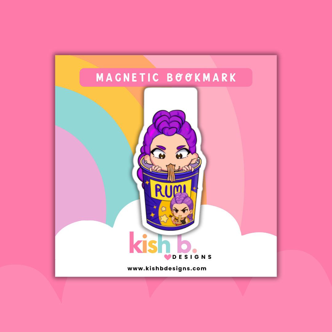 Add a fun twist to your reading with the Demon Hunter's Ramen magnetic bookmark! This adorable K-pop inspired bookmark securely grips your pages, making it easy to find your spot while adding a dash of charm to your books. Perfect for fans who love to blend cuteness with function. Approx size: 2.5 inches in width.