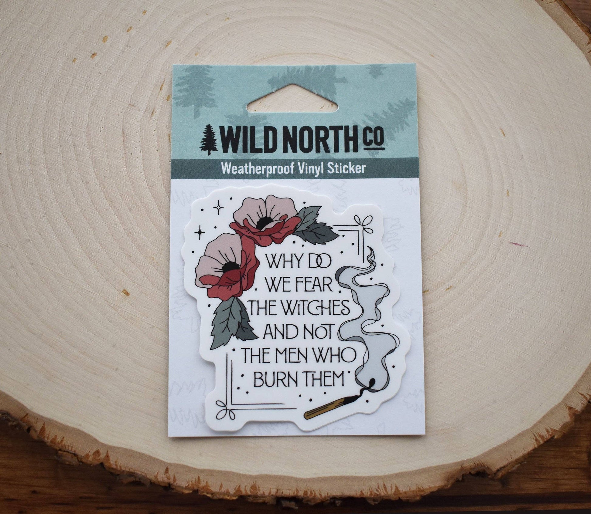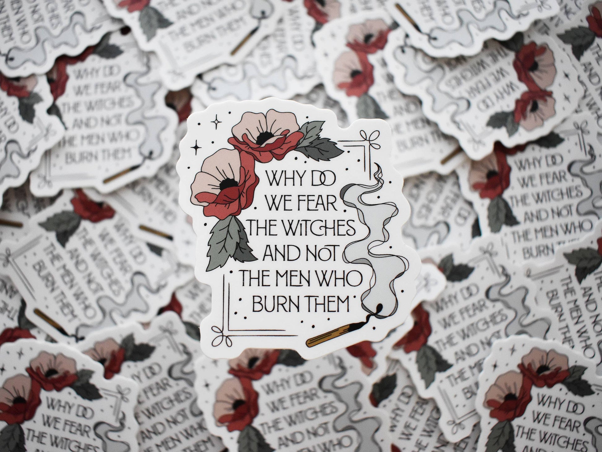 But really, why do we fear the witches and not the men who burn them? STICKER INFO * Approximately 2.72x2.95" * Matte protective coating * Scratch, Water, and Sun resistant * Perfect for water bottles, e-readers, cars, it's even dishwasher safe!