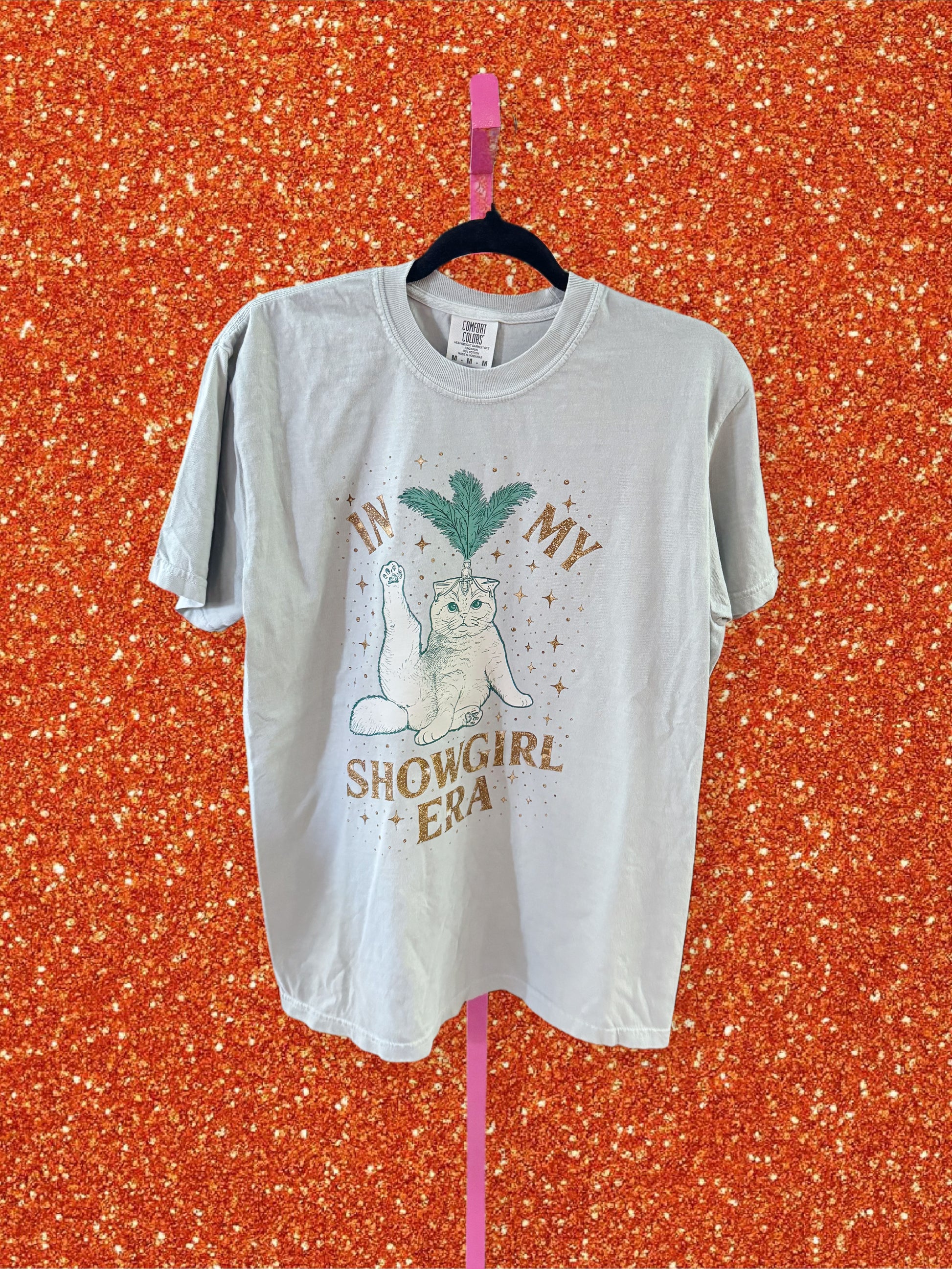 “In My Showgirl Era” image. Heat pressed, to care - wash cold, dry low/medium heat. Comfort Colors color Bay. 100% cotton.
