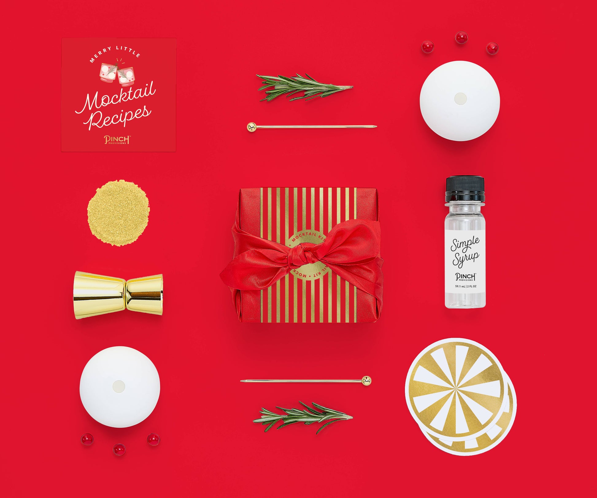 Prove that sobercurious doesn't have to be so serious with this luxe Mocktail Kit by Pinch Provisions! This festive assortment of 11 zero-proof essentials is ready to gift in a Furoshiki-style bow box. Whether you’re hosting a holiday party or just having a fun night-in, sip in style with 2 spherical ice cube molds, 2 fl.oz. simple syrup, gold jigger, gold cocktail picks (2), edible gold drink glitter, coasters (2), and a mocktail recipe booklet.