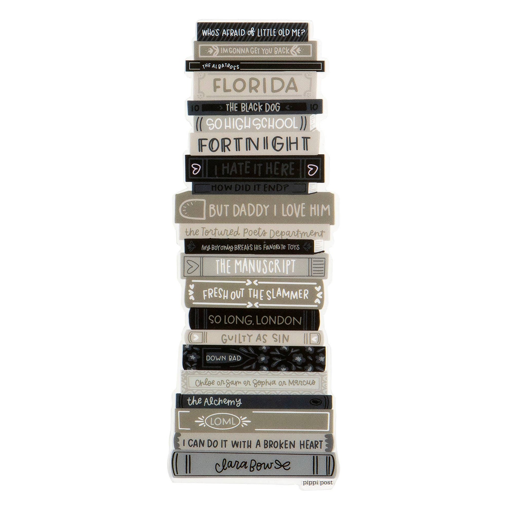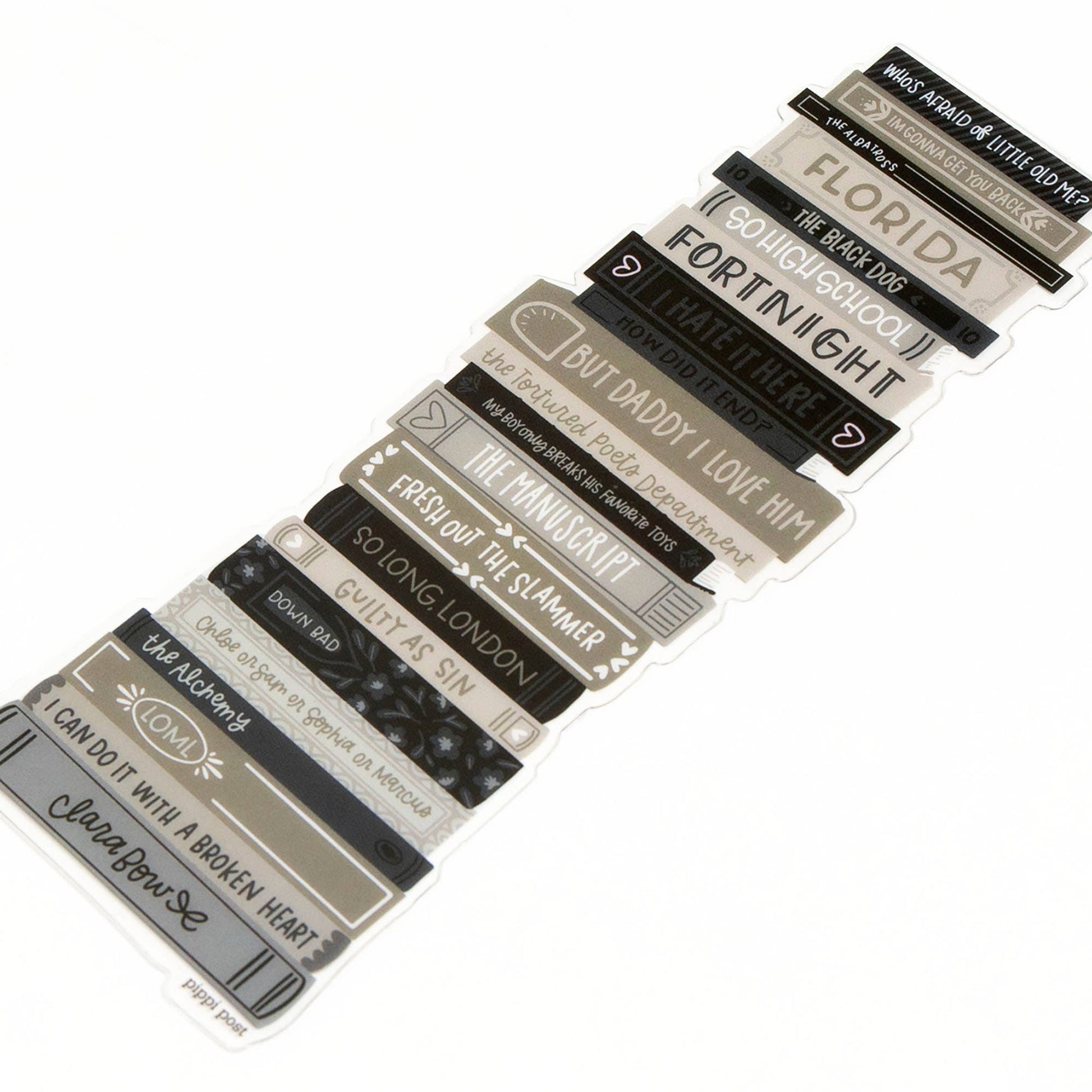Introducing the Poetry Book Stack Transparent Bookmark—a perfect companion for fans of the album and book lovers. This unique bookmark features a stack of book spines, each title inspired by songs from the album. Keep your place in style while celebrating storytelling with this beautifully designed, transparent bookish accessory. Perfect for marking your favorite passages in any book, this bookmark is a must-have for music fans and bookworms alike.