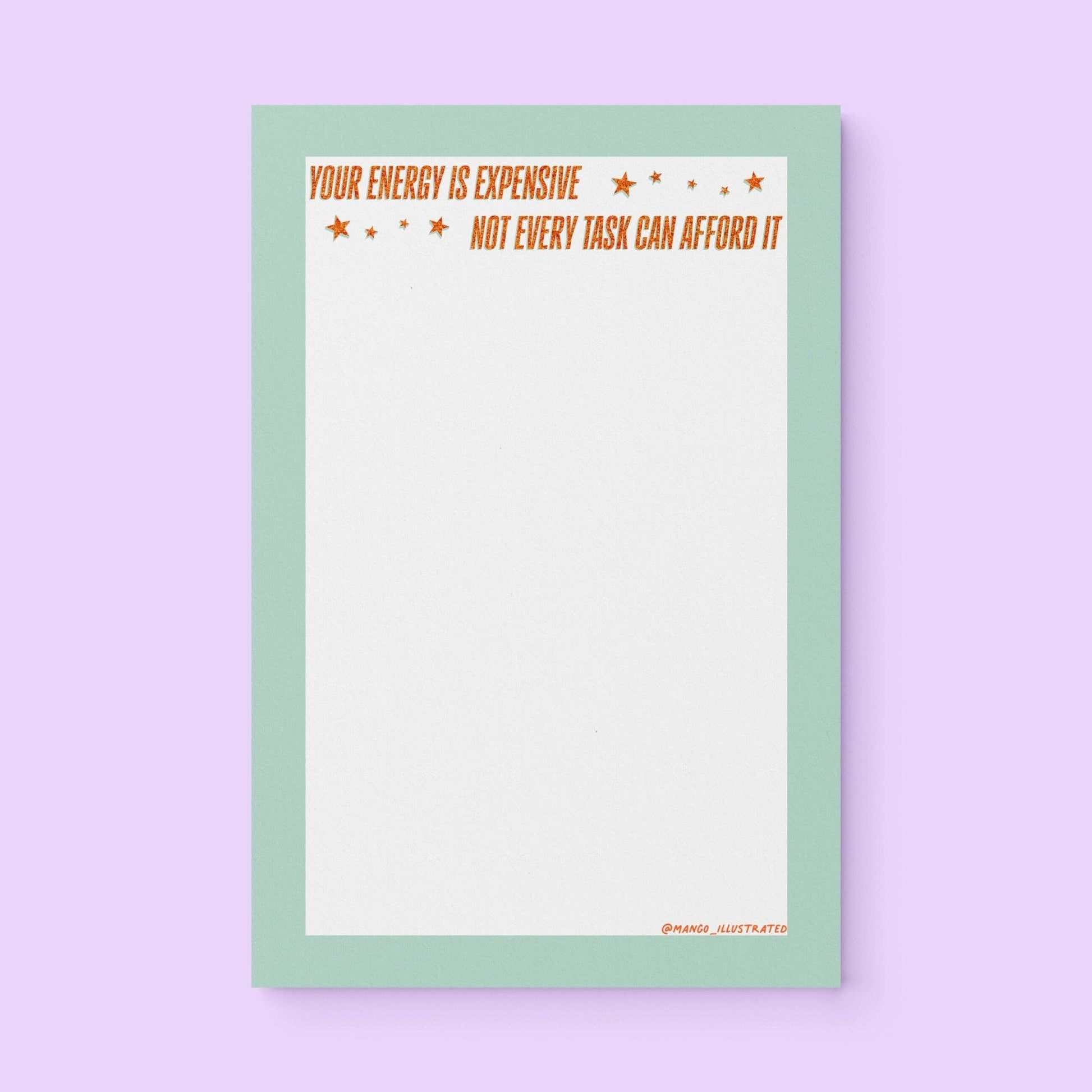 Protect your peace and prioritize what matters with our “Your Energy Is Expensive” notepad. Featuring the empowering quote “Your energy is expensive, not every task can afford it” in bold orange typography with star accents, this stationery piece is a gentle reminder to set boundaries while staying organized.
