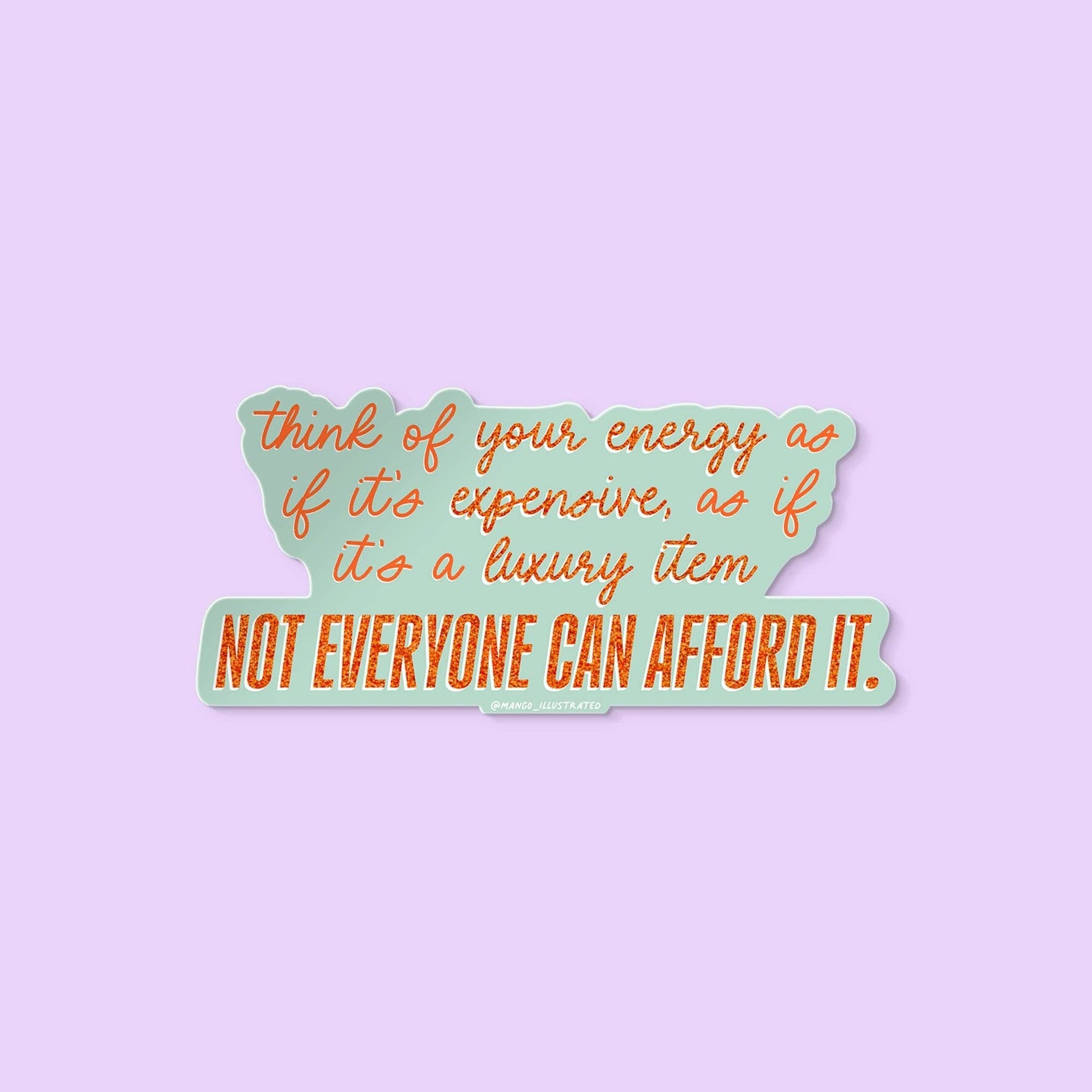 Honor your energy like the luxury it is with the “Your Energy is Expensive” Sticker. This bold vinyl sticker features the inspiring quote “Think of your energy as if it’s expensive, as if it’s a luxury item. Not everyone can afford it” — a glitter-styled reminder to protect your peace and set boundaries unapologetically. Perfect for laptops, water bottles, phone cases, or journals, this waterproof and durable sticker brings daily affirmation and main character energy to your everyday essentials. Whether you’re a Swiftie who loves empowering lyrics and quotes, or someone ready to set boundaries in style, this sticker is your personal reminder that your vibe is priceless. ✨ Great for: Self-care enthusiasts, Swifties, showgirls, boundary-setters, and anyone who wants to carry motivational energy wherever they go. Size: Approximately 3 in x 3 in Material: High-quality waterproof and weatherproof vinyl Perfect for: Swifties, pop culture lovers, and those in their Showgirl Era