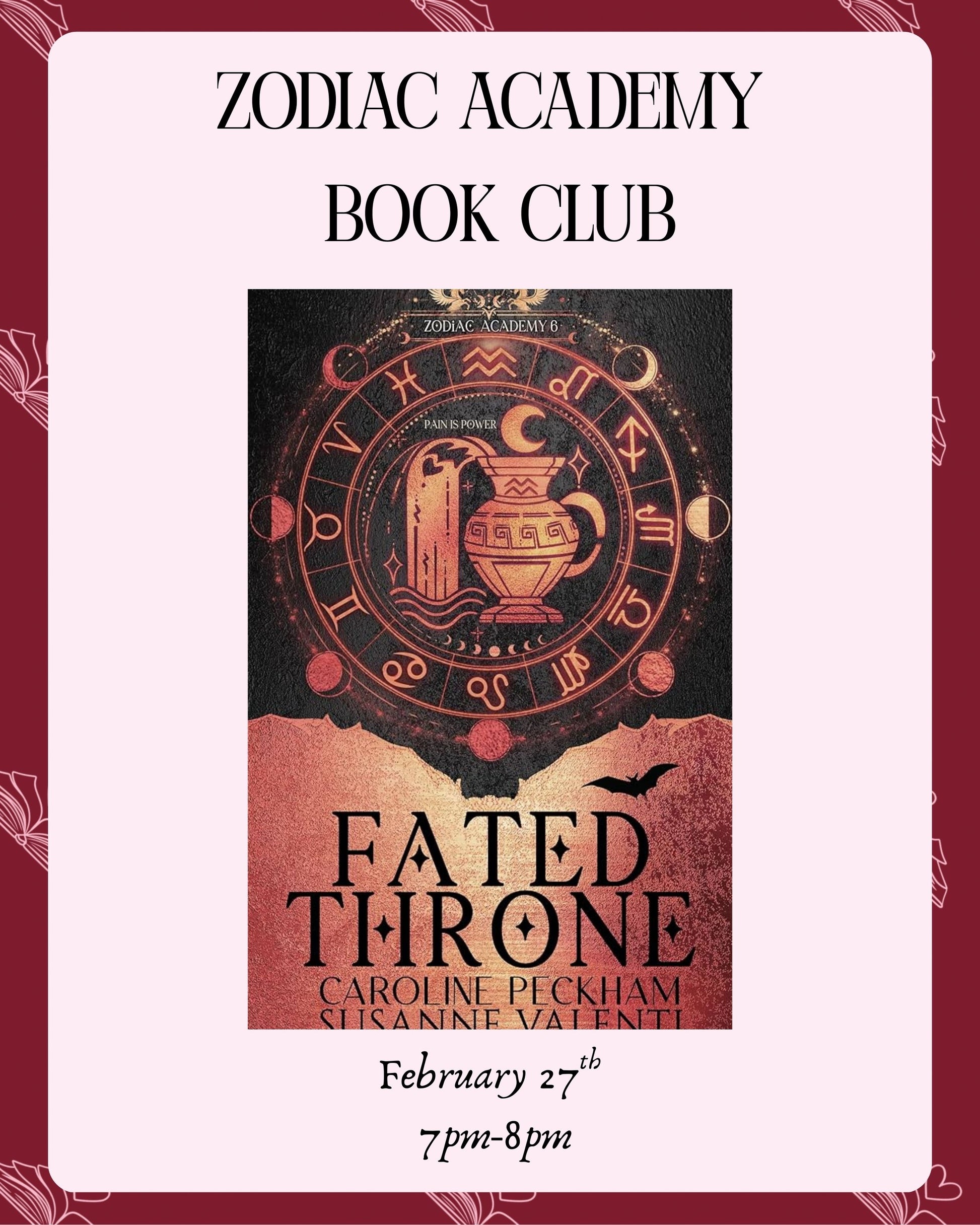 Join Tiffany and Krisha on February 27th from 7pm-8pm to discuss book 6 of the Zodiac Academy series, Fated Throne!