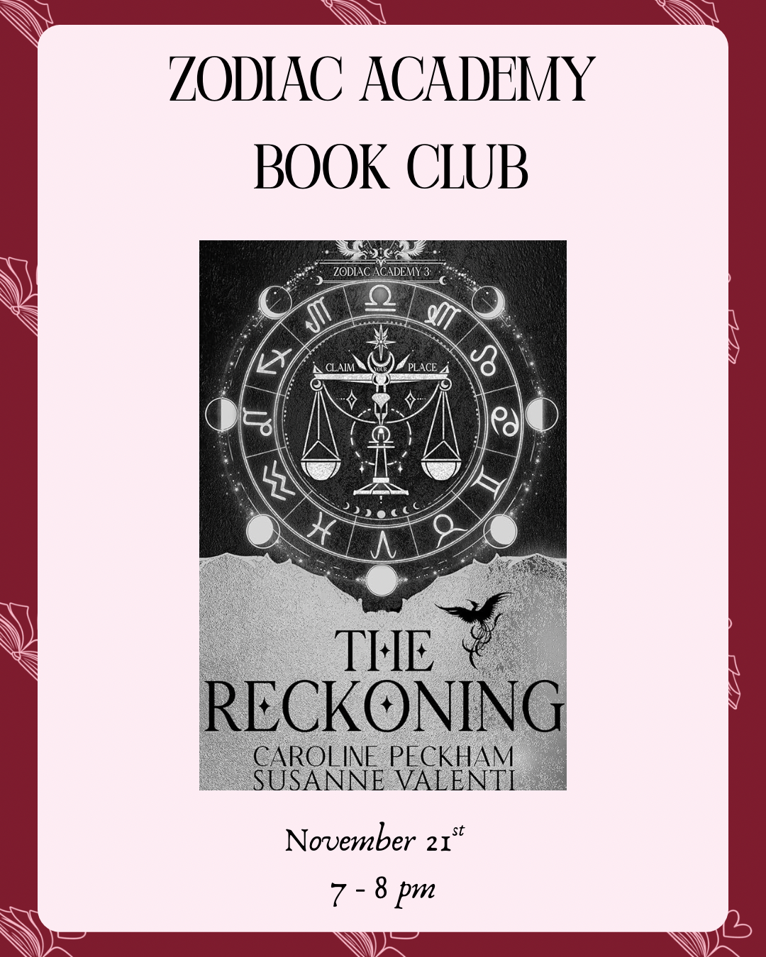 Join Tiffany and Krisha on November 21st from 7pm-8pm to discuss book 3 of the Zodiac Academy series, The Reckoning!